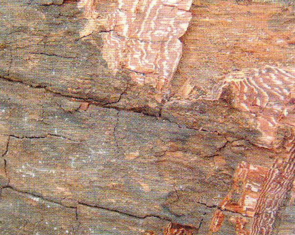 厚約0.5 cm,質(zhì)硬脆,易塊狀剝離外皮灰黑色,具不規(guī)則淺龜裂,易小片狀脫落。內(nèi)皮紫紅色,斷面見白色弦向帶、斜削面呈紫白相間的斑馬紋,為其主要的識(shí)別特征。