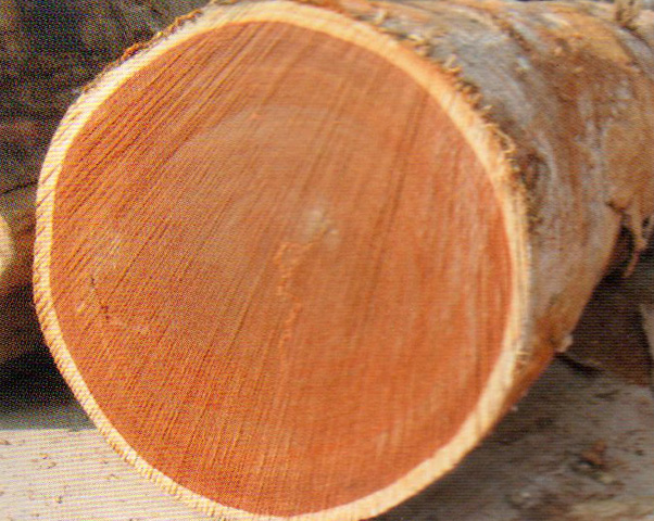 心邊材區(qū)別極明顯、心材暗紅褐色,略具深色條紋、邊材淡黃白色,厚3~4 cm。生長輪略明顯。