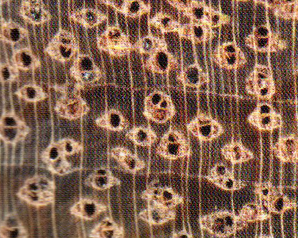 散孔材。管孔肉眼下明顯,少,略大;主為單管孔,少數(shù)經列或斜列復管孔(2~3個);具黑色樹膠及硫黃色沉積物。軸向薄壁組織肉眼下明顯,發(fā)達,翼狀、聚翼狀及輪界狀。木射線放大鏡下明顯,密度中,甚窄。